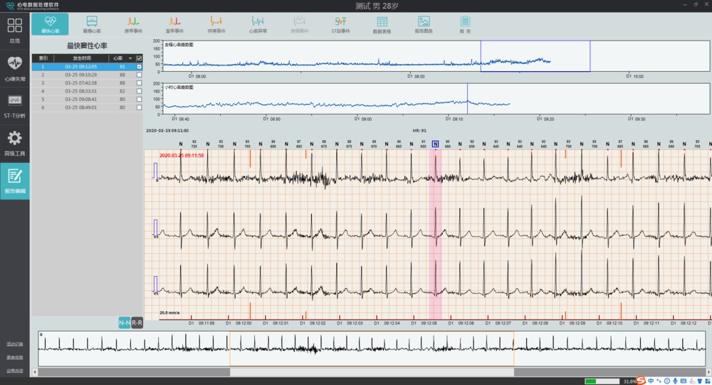 总览界面:将直方图、心率趋势图、时间散点图和可编辑散点图同屏显示,患者情况一目了然